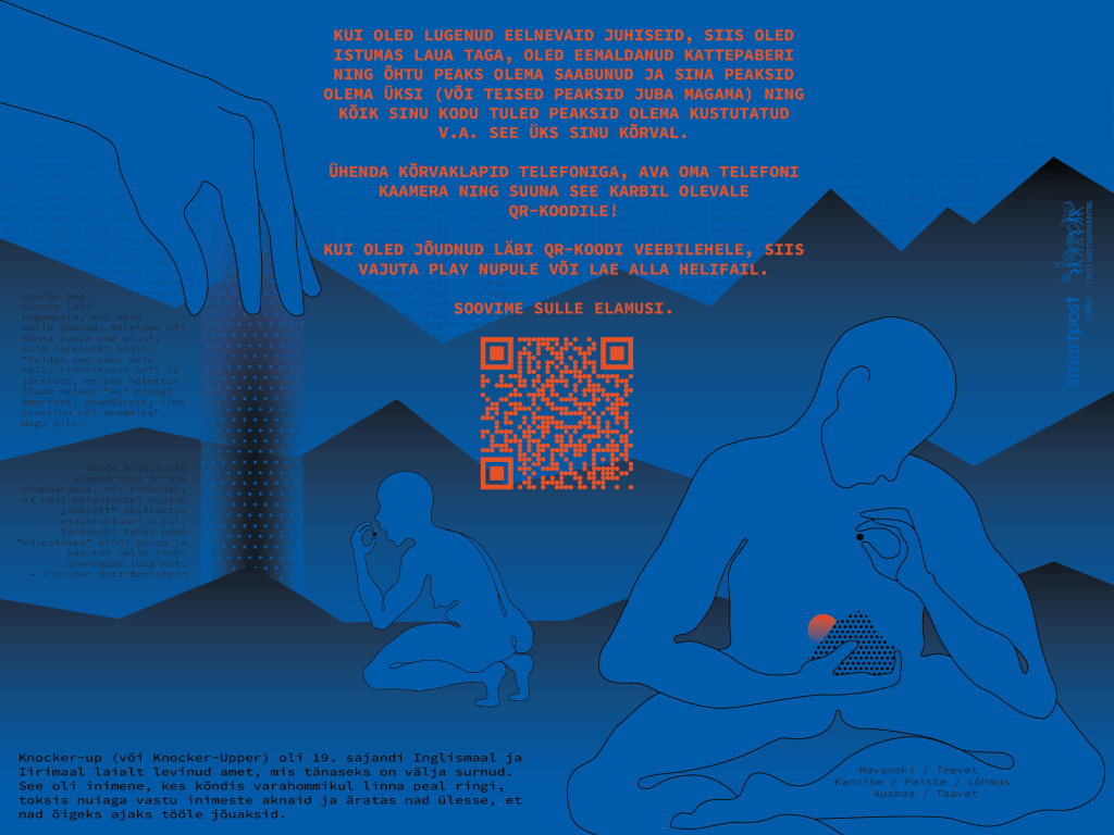 “Talk me to sleep” was an audio performance by Paide Teater which took place between the safe walls of listeners´ home in the quiet of the night. Audience of the audio theatre recieved a box with instructions and let the narrator lead them through their familiar environment towards a sleep. Each box was filled with blue sand and a unique matchbox, which were part of a dreamlike journey that accompanies listeners while exploring their relationship with home and hidden routines in it.