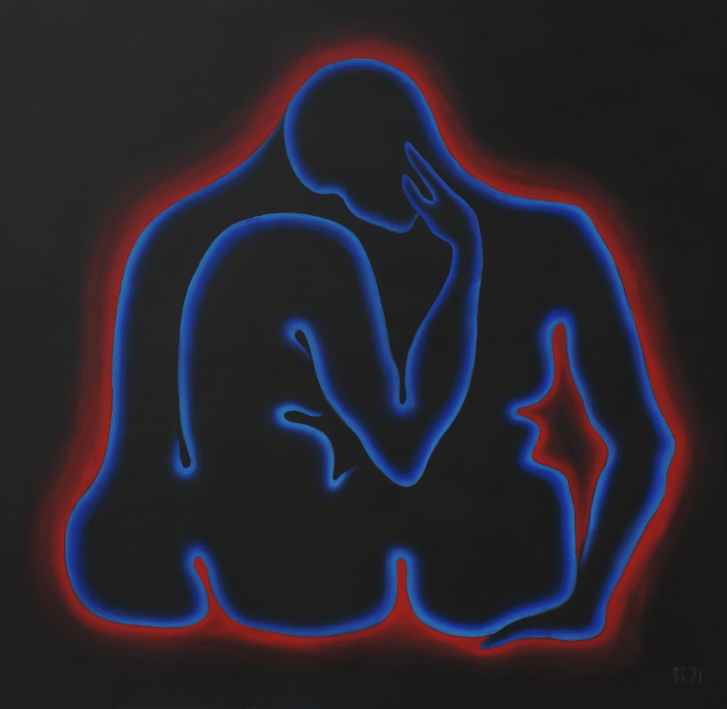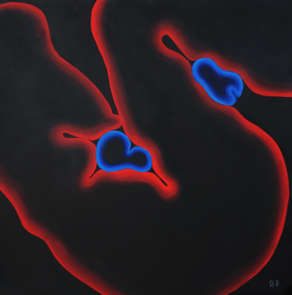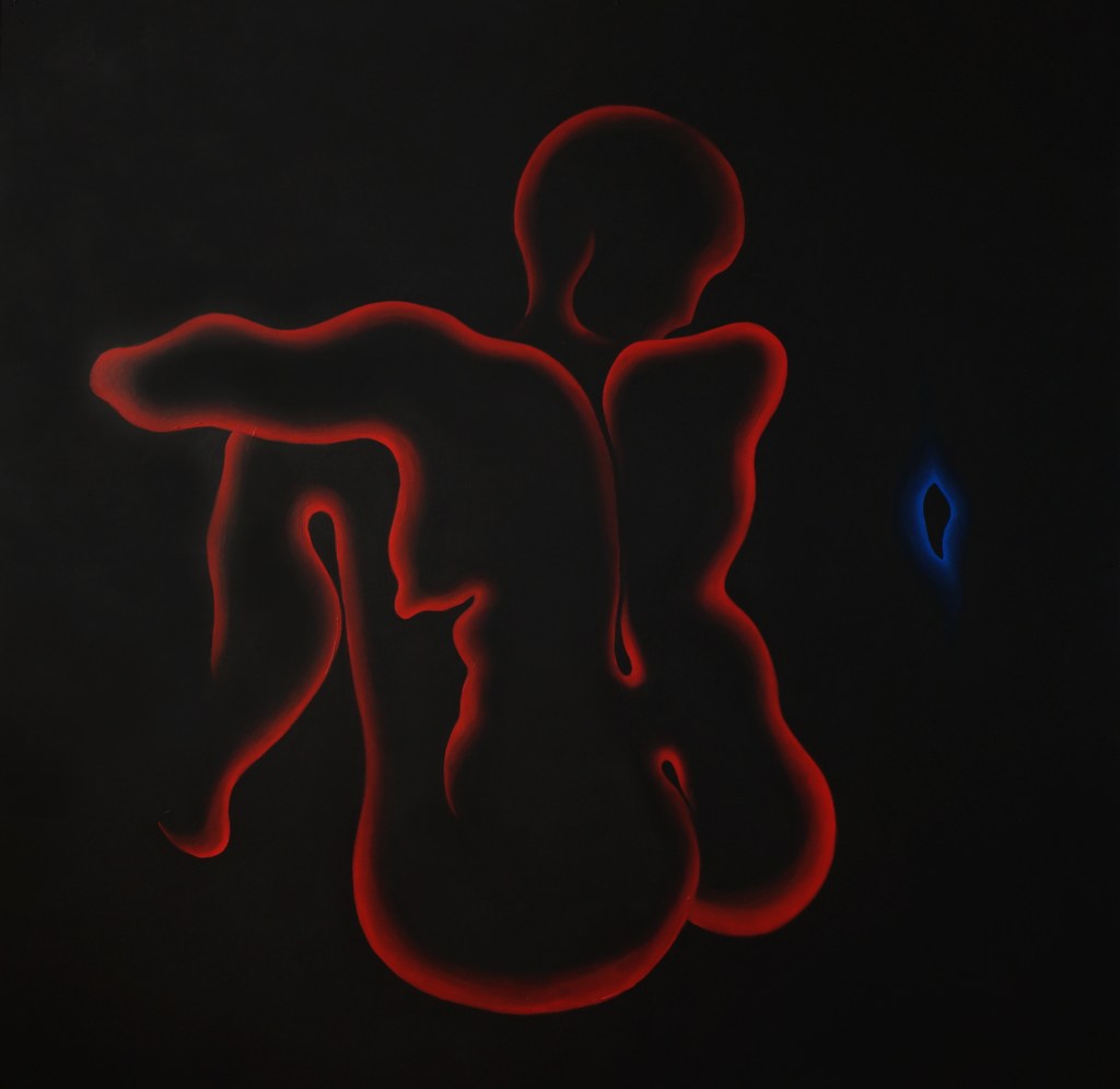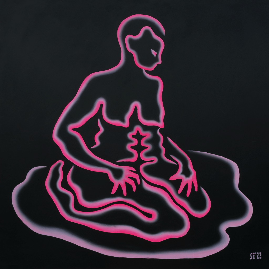 The primary subject of Saskia’s uncanny paintings are anonymous entities that represent the human form, whose cautious but curious nature reflects the artist’s own introspective quests. The contrast between the incandescent monochrome figures and their pitch-black surroundings leaves the impression that these peculiar viscous humanoids are floating in cosmos or the deep sea, where the sun does not reach and time stands still. The faceless subjects with continuous and serpentine forms are sometimes awkwardly looking for contact and at other times meditatively retreating into a cocoon. They could be facing their fears in a childish discovery frenzy or bury their heads in the sand. Even though Saskia’s works are primarily based on her affective memory and her own sense of the world, they seem universal.