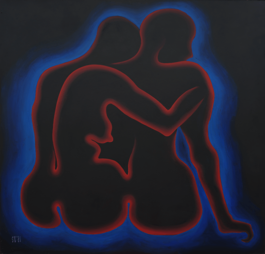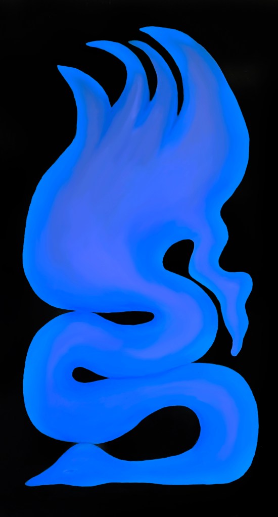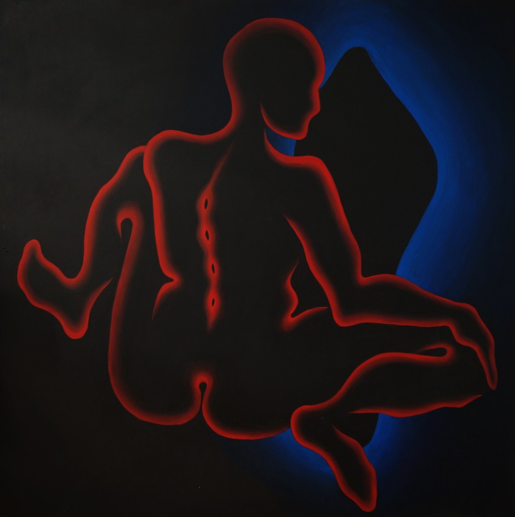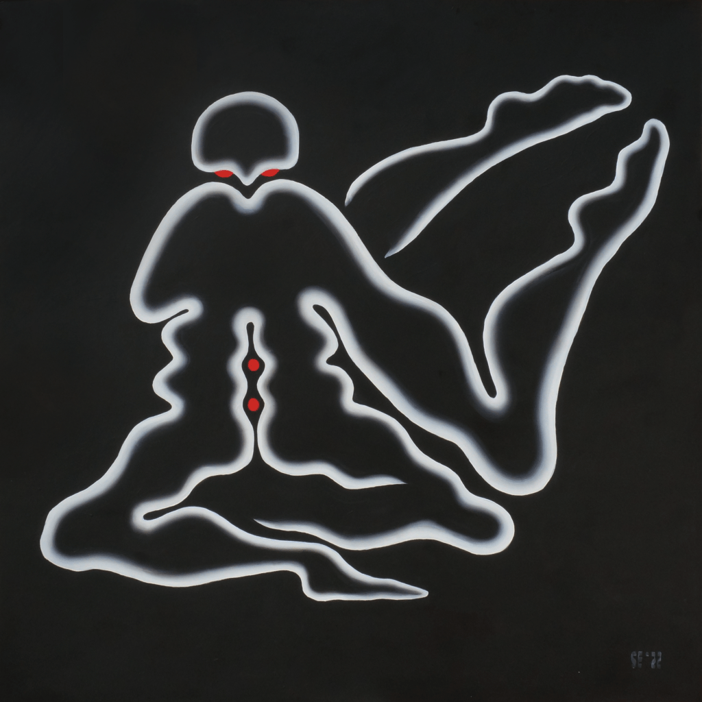 The primary subject of Saskia’s uncanny paintings are anonymous entities that represent the human form, whose cautious but curious nature reflects the artist’s own introspective quests. The contrast between the incandescent monochrome figures and their pitch-black surroundings leaves the impression that these peculiar viscous humanoids are floating in cosmos or the deep sea, where the sun does not reach and time stands still. The faceless subjects with continuous and serpentine forms are sometimes awkwardly looking for contact and at other times meditatively retreating into a cocoon. They could be facing their fears in a childish discovery frenzy or bury their heads in the sand. Even though Saskia’s works are primarily based on her affective memory and her own sense of the world, they seem universal.