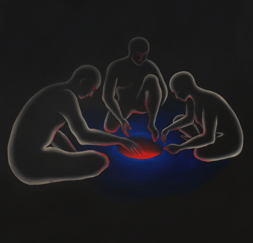 Although the compositions exhibited contain layers that are deeply personal, they also express warm humor and gentle irony, which looking around the exhibition, is most evident in the eponymous painting, where a gawky and stoic circle of figures is fiddling a hole.